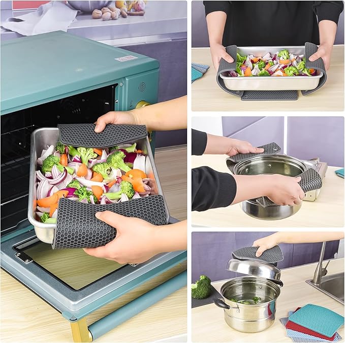 This set of 4 silicone trivet mats is perfect for hot dishes, pots, and pans. Non-slip and heat resistant. Teal color.